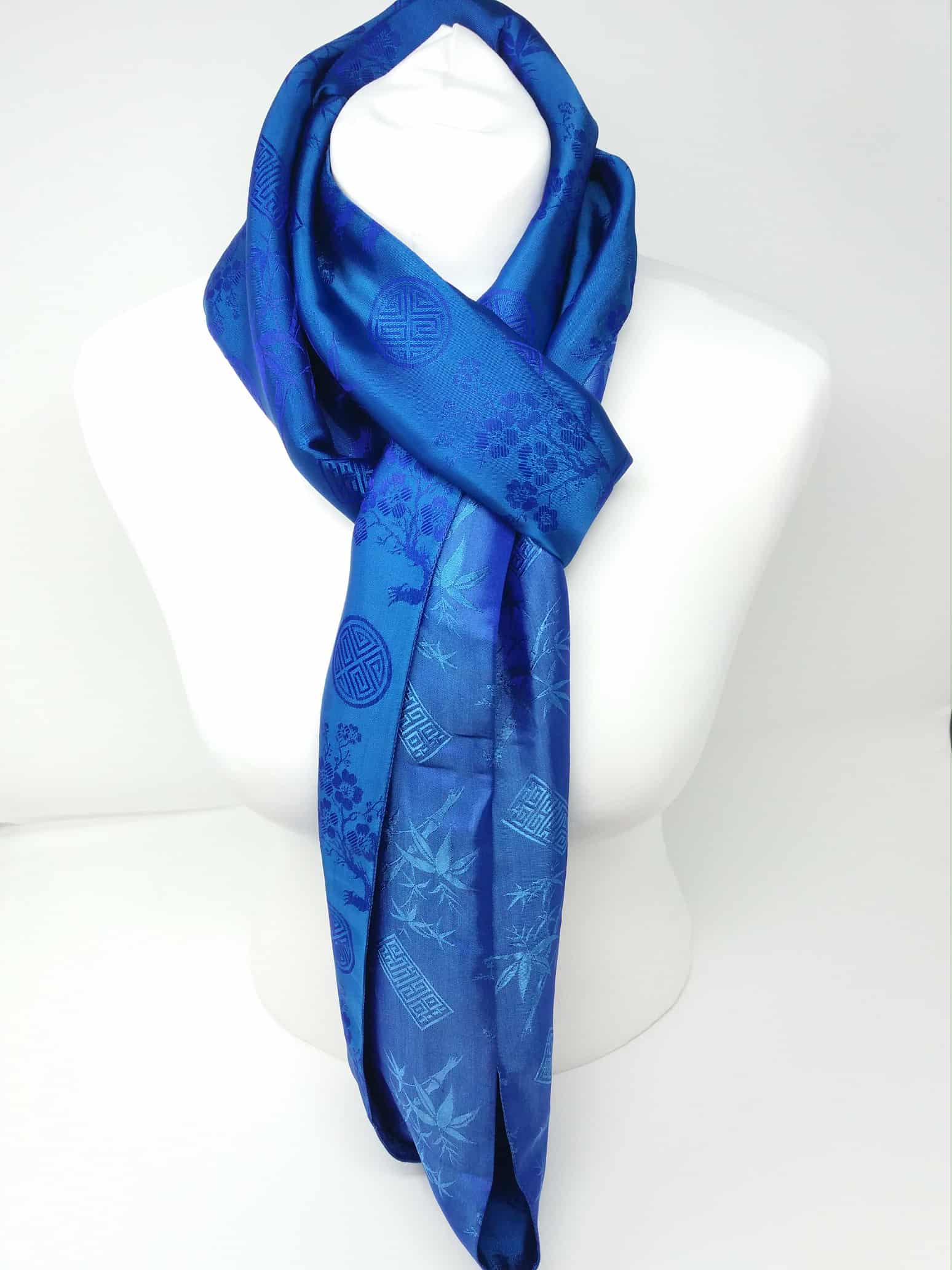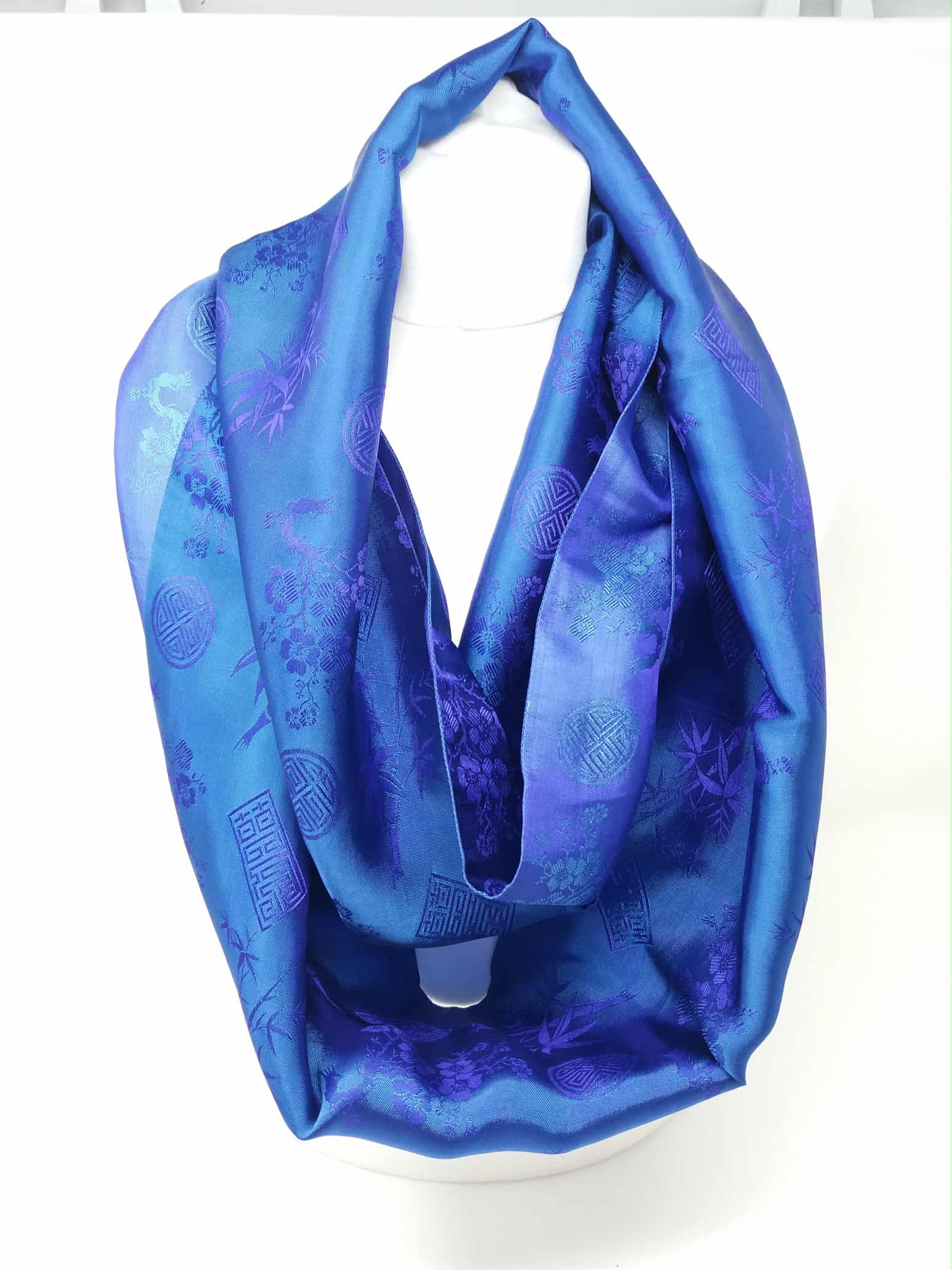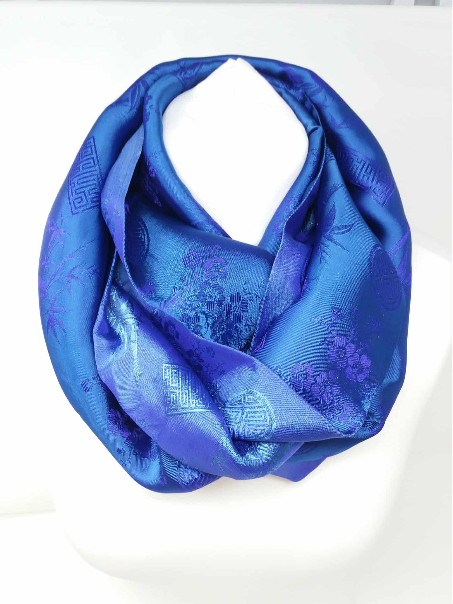 Our luxury infinity scarfs are handmade and design by Millie & Boo. They are made by our local producers in Vietnam feature a beautiful subtle design. Each infinity scarf of snood as they are often referred to  are made with a jacquard silk blend, this technique combines two colours and materials that are  cross woven through the fabric so you get a lovely iridescent colour change in the light. Each side of the scarf has one colour more prominent so once wrapped around you get a combination of both colours.